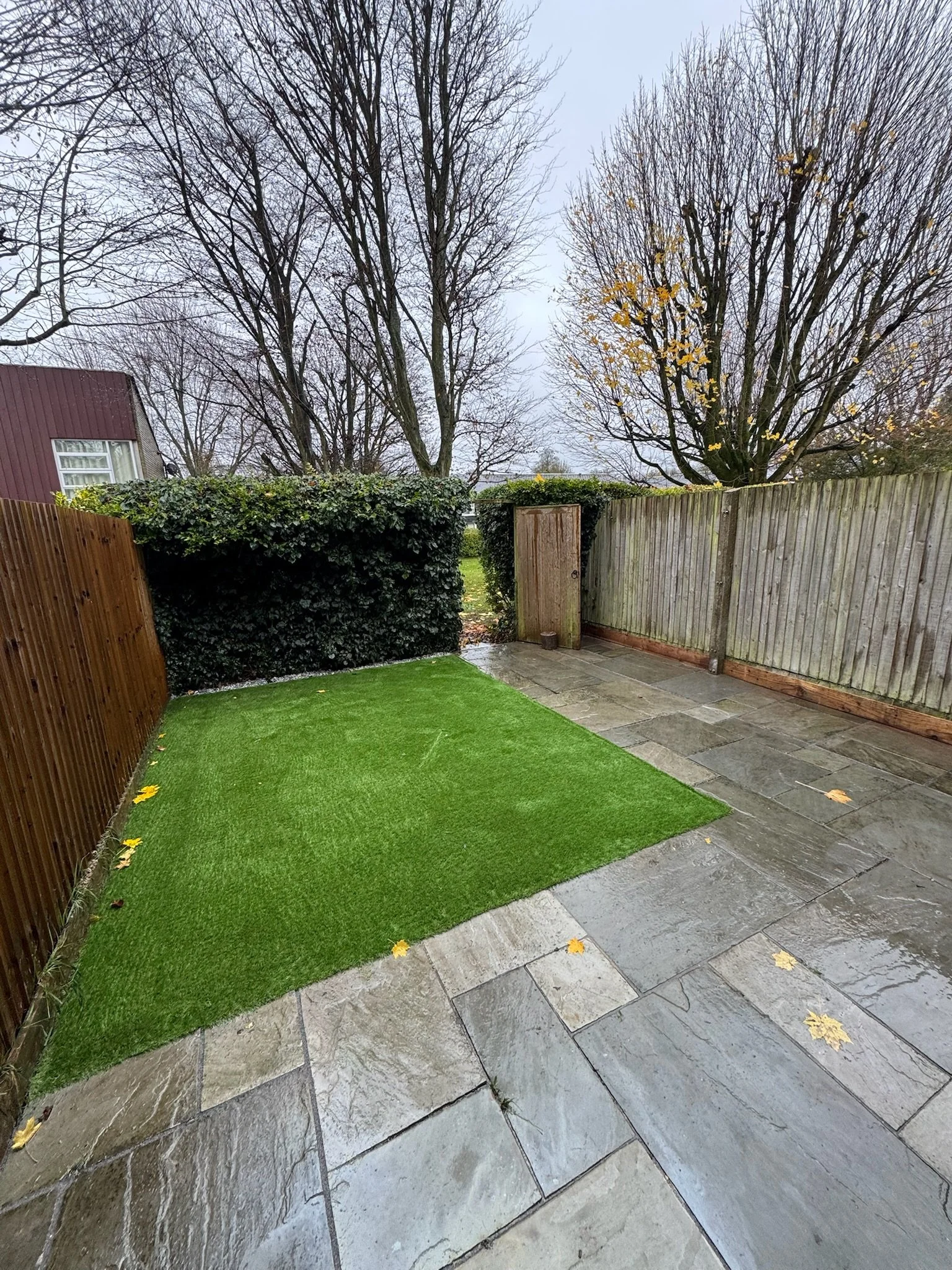 Beautiful Kandla Grey Porcelain Patio (paired with new featheredge fencing and a custom built brick planter to match existing).